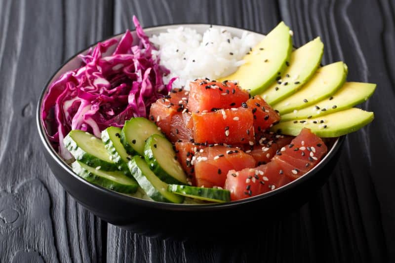El poke bowl ha conquistado a un público joven que busca opciones completas y saludables. Se trata de una ensalada de arroz o base de cereal con pescado crudo (normalmente atún o salmón), verduras, frutas y salsas. Es una de las recetas pescado crudo más interesantes para servicio rápido o delivery.